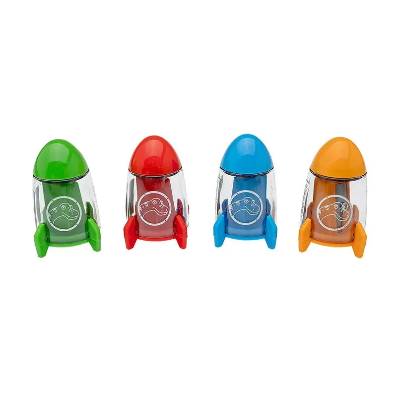 Em formato de foguete, o apontador é super fofo e convidativo para brincar mesmo quando em uso. Ele vem com uma borracha escondida. Basta tirar a ponta da nave e usar a borracha para apagar o que precisar. Além disso, o foguete é equipado com um depósito interno, permitindo que se colete as aparas de lápis de forma prática, evitando sujeira em mesas ou na superfície de trabalho.