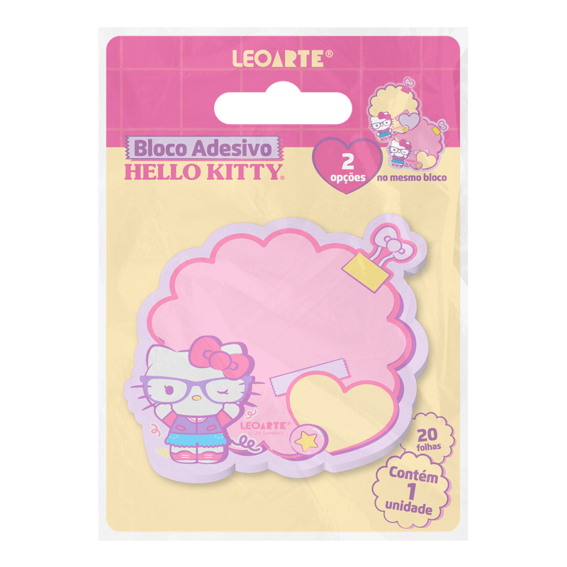 É 1 bloco adesivo colorido e em formato diferenciado, com 20 folhas no total, sendo 10 de cada estampa com a própria Hello Kitty. Ambas as ilustrações vêm com traços modernos, cores bonitas e desenhos chamativos.