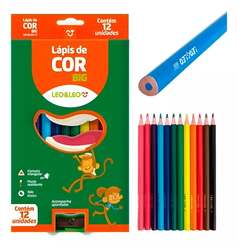 Lápis de cor Big possui formato triangular, 15cm de altura, mina de 4mm macia e resistente, vem com apontador; Embalagem: Estojo com 12 Cores + apontador simples cor sortida