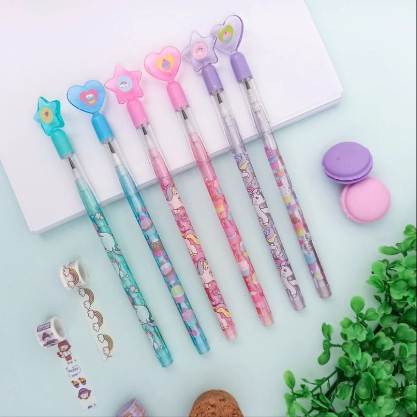 A lapiseira troca ponta tik tak é ideal para so escolar ou escritas em geral.. a tampa tem formato animado.